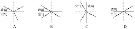 13.下图画出了光线射在空气与玻璃的界面处发生反射和折射的四幅光路图,其中正确的是 ( )