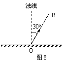 28.(上海)在图8中,根据给出的反射光线OB画出入射光线AO,并标出入射角及其度数。