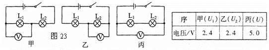 27.吴毅强同学在探究“串联电路各电压的关系”时,分别按如图23甲、乙、丙三个测量电路进行了正确的测量,测量结果U1、U2、U如右下表所示。