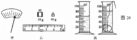 (3)用天平称矿石的质量,把矿石放在天平的左盘。天平平衡时.放在右盘中的砝码和游码在标尺上的位置如图24乙所示;此时天平的示数是 g;量筒量出矿石的体积如图24丙所示,矿石的体积是 cm3。