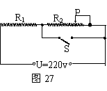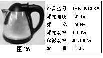 如图26是某种有保温功能的家用电热水壶及铭牌。内部电路如图27所示,当S闭合时,接通电源,电热水壶正常工作。当水烧开时,开关S会自动断开,电热水壶自动进入保温状态,调节开关P,可调节不同的保温功率。
