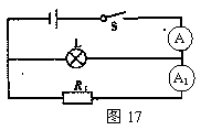 (7分)如图17所示,电源电压不变。闭合开关S,小灯泡L恰好正常发光。已知R1=12Ω,电流表A1的示数为0.5A,电流表A的示数为1.5A。