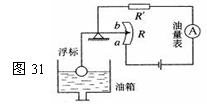 图31是汽车、摩托车油量表(实际上就是电流表)原理示意图,R′是定值电阻,R是滑动变阻器,则 ( A )