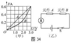 1. 有两个电路元件A和B,流过元件的电流与其两端电压的关系如图34(甲)所示.把它们串联在电路中,如图34(乙)所示.闭合开关S,这时电流表的示数为0. 4A,则电源电压和元件B的电功率分别是( C )