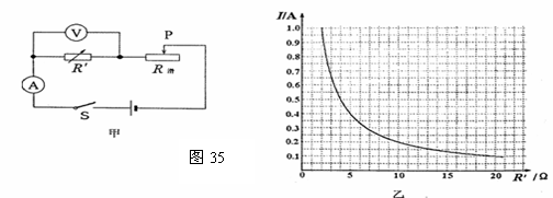 2. 小明用图35甲所示的电路,研究通过导体的电流与导体电阻的关系.电源电压恒为6V.实验过程中,他做了六次实验,每次改变电阻箱R',的阻值后.通过调节滑动变阻器始终保持R'两端的电压不变,记下相应的电流值.根据记录的六组数据,他在方格纸上描出了电流I与电阻箱阻值R'的关系图线,如图35乙.