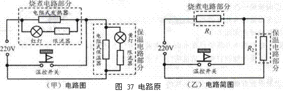 4. 如图35是电饭锅的实物图,图36(甲)是它的内部电路图,图36(乙)是电路简图它有“高温烧煮”和“焖饭、保温”两挡,由温控开关自动控制.煮饭时,先要按下温控开关按钮;到达设定温度(饭已煮熟),按钮会自动弹起 (1)对照观察图36(甲)和(乙),温控开关按钮未按下时,“烧煮电路部分”与“保温电路部分”是_串联_关系(选填“串联”或“并联”);按下温控开关按钮.“烧煮电路部分”的电压为_220_V,“保温电路部分”将_不工作(选填“工作”或“不工作”);温控开关按钮弹起后,电路中的电流比原来_小_(选填“大”或“小”)。 (2)当温控开关按钮按下时,电饭锅电路的总功率为1100W。求:“烧煮电路部分”的电阻R1 (3)温控开关按钮弹起后,电饭锅电路的总功率为44W。求:①电路中的电流;②“保温电路部分”的电阻R2 (4)已知,只有当指示灯和限流器两端的电压与电源电压相差不大时,指示灯才会发光.请通过相关计算或分析,说明为什么温控开关按钮弹起时,红灯熄灭而黄灯亮。