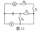 图13所示的电路中,R1、R2均为定值电阻.电源电压不变.闭合开关S1、S2,两电表均有示数;再断开开关S2,则电压表示数 ▲ ,电流表示数 ▲ ,电压表与电流表示数之比 ▲ 。