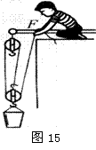 (6分)如图15所示,建筑工人用滑轮组提升重为220N的泥桶,动滑轮重为20N,不计滑轮与轴之间的摩擦及绳重. 若工人在5s内将绳子匀速向上拉6m,求: