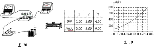 (2)如果电阻的大小随磁场的强弱变化而变化,则这种电阻叫磁敏电阻。某磁敏电阻R 的阻值随磁感应强度B变化的图象如图19所示。根据图线可知,磁敏电阻的阻值随磁感应强度B的增大而 ▲ 。图线没有过坐标原点,是因为 ▲ 。