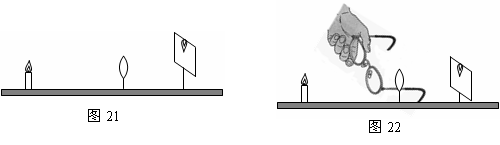 (4)在上一步实验获得清晰的像后,小明取了一付近视眼镜放在凸透镜前(如图22所示),观察到光屏上的像变模糊了,此时要使光屏上成清晰的像,应该将光屏向 ▲ 移(选填“左”或“右”).