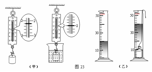 方法2:阿基米德原理法。测量过程与示数如图23(乙)所示,读出排开水的体积,根据F浮=G排=ρ水V排g可计算出浮力为 ▲ N。