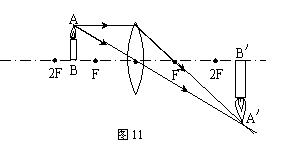 17.赵亮同学利用光路图作出了当蜡烛位于一倍焦距和二倍焦距之间时成像的特点(如图11所示)。实际上,从烛焰A点发出的无数条光线透过凸透镜发生折射后,都在A′点会聚,A′点就是A所成的像点。赵亮在作图时选择的是两条特殊光线,其中一条是“经过光心的光线,经透镜后不改变传播方向,沿直线传播”,请你仿照划线部分的描述,对另一条光线进行描述:_________________▲ ______________。