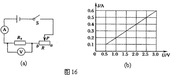 24.图16(a)是某同学探究电流与电压关系的电路图,开关S闭合后,将滑动变阻器的滑片P从a端移至b端,电流表和电压表的示数变化关系如图16(b)所示。由图像可得:定值电阻Ro的阻值是 ▲ Ω。实验时,电源电压3V保持不变,当滑片P位于a端时,滑动变阻器消耗的电功率是 ▲ W。