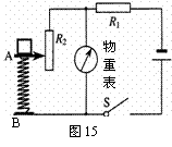 23.某校物理兴趣小组设计了一种“电子秤”,实际上是压力测量仪,用它来称量物体的重力,其原理结构如图15所示。图中A为金属片,B为金属板,R1=24Ω, R2是阻值最大值为72Ω的滑动变阻器,电源电压为12V不变。则图中物重表应该用 ▲ (电流表/电压表);当称量物体的重力达到最大值时,R2两端的电压为 ▲ V。
