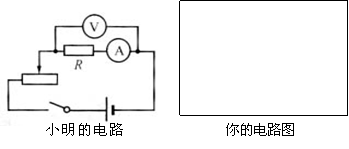 小明家新买了一条标有“220V,50W”的电热毯,他想用电流表和电压表测量电热毯的电阻值,于是连接了如图14的电路,其中R为待测电阻,电源两端的电压为6V,滑动变阻器的最大阻值为20Ω。但是,小明在测量过程中发现,无论怎样调整滑动变阻器,电表的示数都几乎没有什么变化,且查得各元件完好,电路连接无误,请分析产生这一现象的原因。如果仍然使用这些器材,怎样连接电路才能有效地改变电热毯两端的电压?在小明电路图的右侧画出你的电路图
