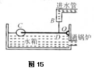 某中学“STS”课题小组到某工厂的锅炉车间进行实践活动,重点研究锅炉供水自动控制装置方面的问题,如图15为冷水自控位置,小水箱与锅炉相连,当杠杆呈水平状态时,浮球受到2.5N竖直向上的浮力,塞子B刚好顶住自来水的进口。已知OC=25cm。OD=1cm,塞子B横截面积为1cm2,由此算出自来水对塞子B的压强为多大?