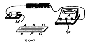22、如图6-7所示,AC、EG分别为长度和粗细都相同的锰铜丝和镍铬丝合金,B、F分别为这两段电阻丝的中点,一位同学用该装置做“研究决定电阻大小的因素”实验,记录数据见下表: