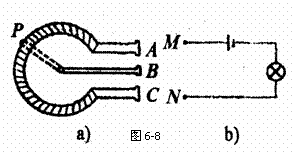 (2分)如图6-8所示,为某种调光型台灯中使用的电位器示意图,P为旋片可随转动旋钮改变在碳膜上的位置,A、B分别连在碳膜两端。以笔画线将a图连在b图所示电路中,要求顺时针转动旋钮可使灯泡亮度增加,则导线应怎样连接?(已知a图中虚线所示为旋钮)。