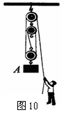 15.如图10所示,小明用滑轮组匀速提起一个重为600N的物体A,物体上升的速度为0.1m/s,人拉绳的力为250N,不计绳重和摩擦,人拉绳做功的功率