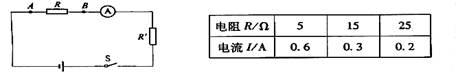 孙楠同学用如图所示的电路研究导体中的电流跟导体电阻的关系,他先后将5Ω、15Ω和25Ω的定值电阻接入电路A、B两点间,闭合开关S,读出电流表示数(如下表)。由实验数据可以看出电流I与电阻R并不成反比。