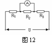 三个电阻值均为10Ω的电阻R1、R2、R3串联后接在电压恒定为U的电路中,某同学误将一只电流表并联在电阻R2两端,如图12,发现电流表的示数为1.5 A,据此可知电源电压U为 V;若用一只电压表代替电流表并联在R2两端,则电压表的示数为
