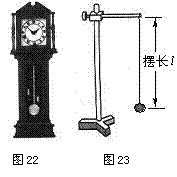 小明发现家里摆钟(图22)的钟摆一直在有规律地摆动,经认真观察发现钟摆来回摆动一次的时间刚好是1秒,就想:是不是所有的摆来回摆动一次的时间都是1秒呢?于是,他请教了物理老师,知道摆来回摆动一次的时间叫做周期,在老师的指导下他设计了如图23所示的单摆(即细绳下系一小钢球)进行探究。实验数据记录如下表: