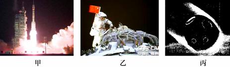 18.“神舟”七号载人飞船的圆满成功,标志着我国跻身世界航天大国!飞船发射时,长征运载火箭点火升空,发射塔下面的水池产生大量的白气,如图甲所示;图乙展示的是翟志刚在太空中挥动五星红旗的情景,他在太空响亮说道“神舟七号向全国人民、向全世界人民问好!”图丙展示的是飞船的返回舱与推进舱成功分离后,返回舱开始进入稠密的大气层,在距地面80km左右时,返回舱表面温度达到2000℃,看上去像个火球。请你观察图片,联想“神舟”七号发射、在太空工作和返回的工作过程,提出两个物理问题,并对提出的物理问题尝试解答。
