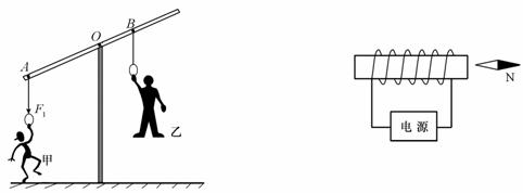 两位同学利用左下图所示的可以绕O点自由转动的健身器材进行锻炼,甲同学竖直向下用力F1将另一端的乙同学拉起。请画出拉力F1的力臂L1。