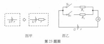 在图乙中R1= 14W , R2= 9W。当只闭合S1时,电流表读数I1=0.2A ;当只闭合S2时,电流表读数I2=0.3A,把电源按图甲中的等效方法处理。求电源的电压U 和电阻r。