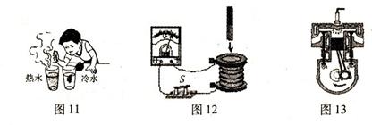 25.如图11,分别在冷水和热水中滴人一滴红墨水,整杯热水很快就变红了。这个现象说明:_______________。如图12,闭合开关后,将条形磁铁插人或拔出线圈时,电流表指