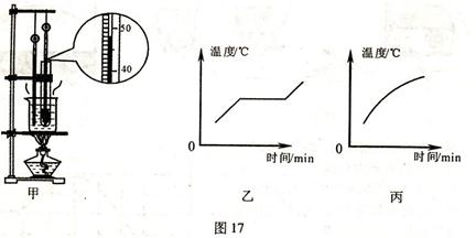 30.用图17甲所示的实验装置分别观察松香和海波的熔化过程,且每隔一定时间记录一次温度,直到两种物质全部熔化。由图17甲可知此时的温度计示数是___________℃。各组同学根据记录数据绘制了这两种物质的熔化图象,如17乙、丙两图所示,其中___________图能反映海波的熔化过程。