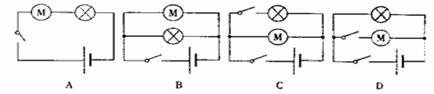 6、教室里投影仪的光源是强光灯泡,发光时温度很高,必须用风扇给予降温。为使灯泡不宜过热被烧坏,要求:带动风扇的电动机启动后,灯泡才能通电发光;风扇不转,灯泡不能发光。则如图所设计的四个简化电路图中最符合要求的是 ( )