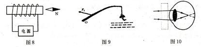 17.(2分)图10是小明同学看远处物体时的光路图,由图可知他是_______(选填“近视”或“远视”)眼,请在图中的虚线方框内填入一个矫一虚有其表视力的镜片。