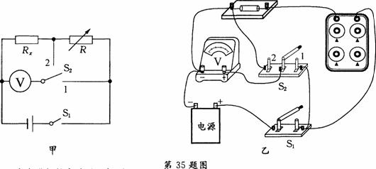 35.(8分)实验室中要测量一个阻值约为数百欧的电阻.提供的器材有:电源(电压约5V)、学生用电压表(0-6V)、电阻箱R(0-9999Ω 5A)、开关S1和S2、导线若干.现要测量待测电阻Rx的阻值,设计了如图甲所示的实验电路图.