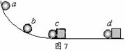 12.如图7所示,是探究“动能的大小与什么因素有关?”实验的示意图。小球从a处滚下,在c处与小木块碰撞,并与小木块共同运动到d处停下。下面的一些判断正确的是( )