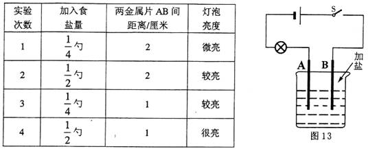 小明利用水、食盐、烧杯、小勺子、电源、刻度尺、小灯泡、金属片、酒精灯等器材,设计了如图13的装置,进行了探究实验.他记录的实验表格如下: