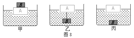 A.插座处短路 B.台灯插头处短路 C.台灯开关处短路 D.台灯灯头处短路16.如图8所示,在三个相同的容器中装有质量相同的水,将木块A、金属块B按不同的方式放入水中,待A、B静止时,三个容器中木块下表面所受的压强相比较,正确的是