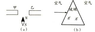19.(4分)如图(a)所示,小磁针处于静止状态,请在图中甲、乙处标出磁极极性(用"或S表示)并画出磁感线(每个磁极画两条).如图(b)所示,请画出光从空气射入玻璃再从玻璃到空气的光路图.
