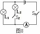 21.如图8所示电路中,电源电压保持不变,闭合开关S1、S2,两灯都发光;当把开关S2断开时,灯泡L1的亮度及电流表示数的变化情况是…( )