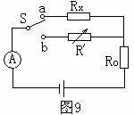 利用如图9所示的电路,测量Rx的阻值.电源电压保持不变, S是单刀双掷开关、R'是电阻箱、R0是已知阻值的电阻、Rx是待测电阻.将开关S拨到a,电流表的示数为I;再将开关S拨到b,调节电阻箱R'的阻值,当电流表的示数为I/2时,读出电阻箱的阻值为R,则被测电阻Rx的阻值为…………………………………………………( )