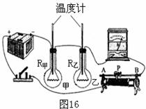 28.小明和小红利用如图16所示的装置探究“导体产生的热量与电阻大小的关系” .质量相等的两瓶煤油中都浸泡着一段金属丝,甲烧瓶中的金属丝是铜丝,电阻比较小,乙烧瓶中的金属丝是镍铬合金丝,电阻比较大.温度计显示煤油的温度.