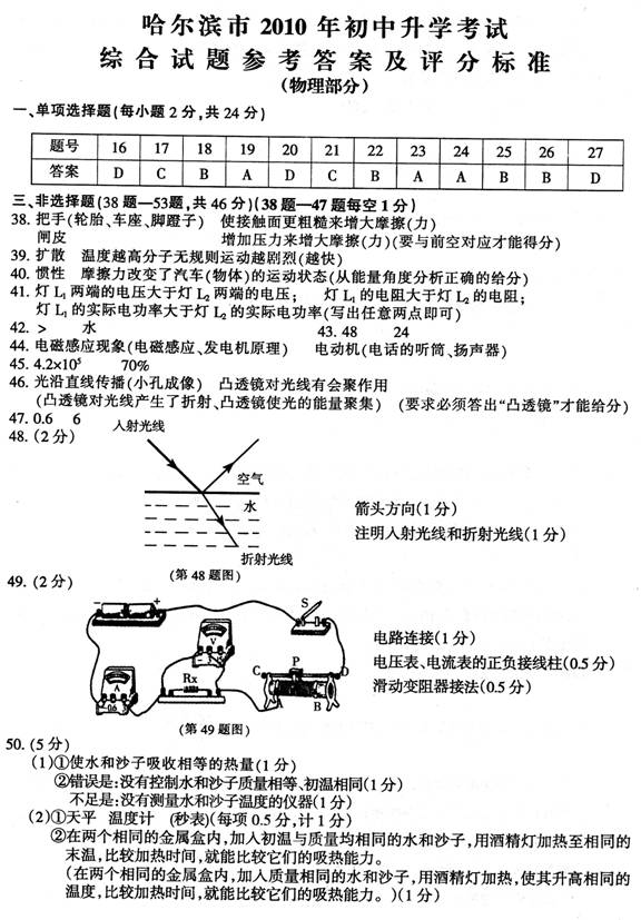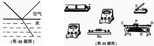 (2分)一束光从空气射入水中,用箭头标出光前进的方向,注明入射光线和折射光线。中考资源网