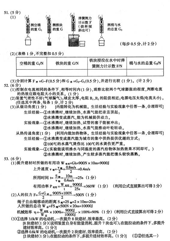 51.(5分)学习浮力知识时,姜萍知道了阿基米德原理,并知道其数学表达式为F浮=G排。中考资源网该同学想通过实验来验证,于是她走进实验室,选择了大烧杯(或溢水杯)、水、弹簧测力计、铁块、小桶、细线这些器材,进行实验。中考资源网