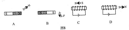15.放在条形磁铁和通电螺线管旁边的小磁针,静止时N极的指向就是小磁针中心所在位置的磁场方向,图8所示的四幅图中,小磁针的指向错误的是