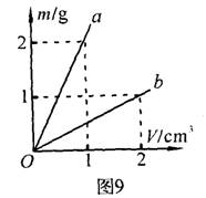 图9是a、b两种物质的质量与体积的关系图像。分别用a、b两种物质制成两个规则的实心长方体甲和乙,下列说法中正确的是
