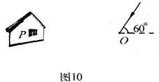 17.如图10所示,在O点放置一个平面镜,使与水平方向成600角的太阳光经O点反射后,水平射人窗口P中。请你在图中画出平面镜的位置,并标出反射角的度数。