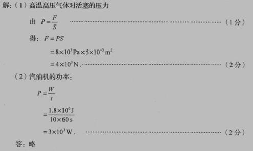19.如图所示,四冲程汽油机活塞面积为5×10-3m2,汽油燃烧产生的高温高压气体对活塞的压强为8×105pa,汽油机正常工作10min所做的功为1.8×106J。求: