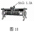 2.(2010年甘肃兰州,28题第4小题)滑动变阻器滑动头上有一个铭牌,铭牌上面标有电流值和电阻值,如图18所示,其中50Ω表示 ;1.2A表示 。