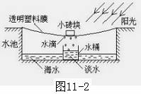7、(09黔东南)身处偏远海岛,按图11-2所示方法可获取少量的淡水。阳光的照射使池内海水加快 ,形成水蒸气;水蒸气在塑料膜上 形成小水滴;塑料膜下表面结成的水滴受 力的作用滑到最低处后滴入水桶中,可得到淡水。