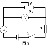 在图8所示的电路中,变阻器R0的滑片P由右向左滑动时,电压表示数的变化范围是0-4V,电流表示数的变化范围是1-1.5A,则电阻R、滑动变阻器R0的最大阻值和电源电压分别是(D)